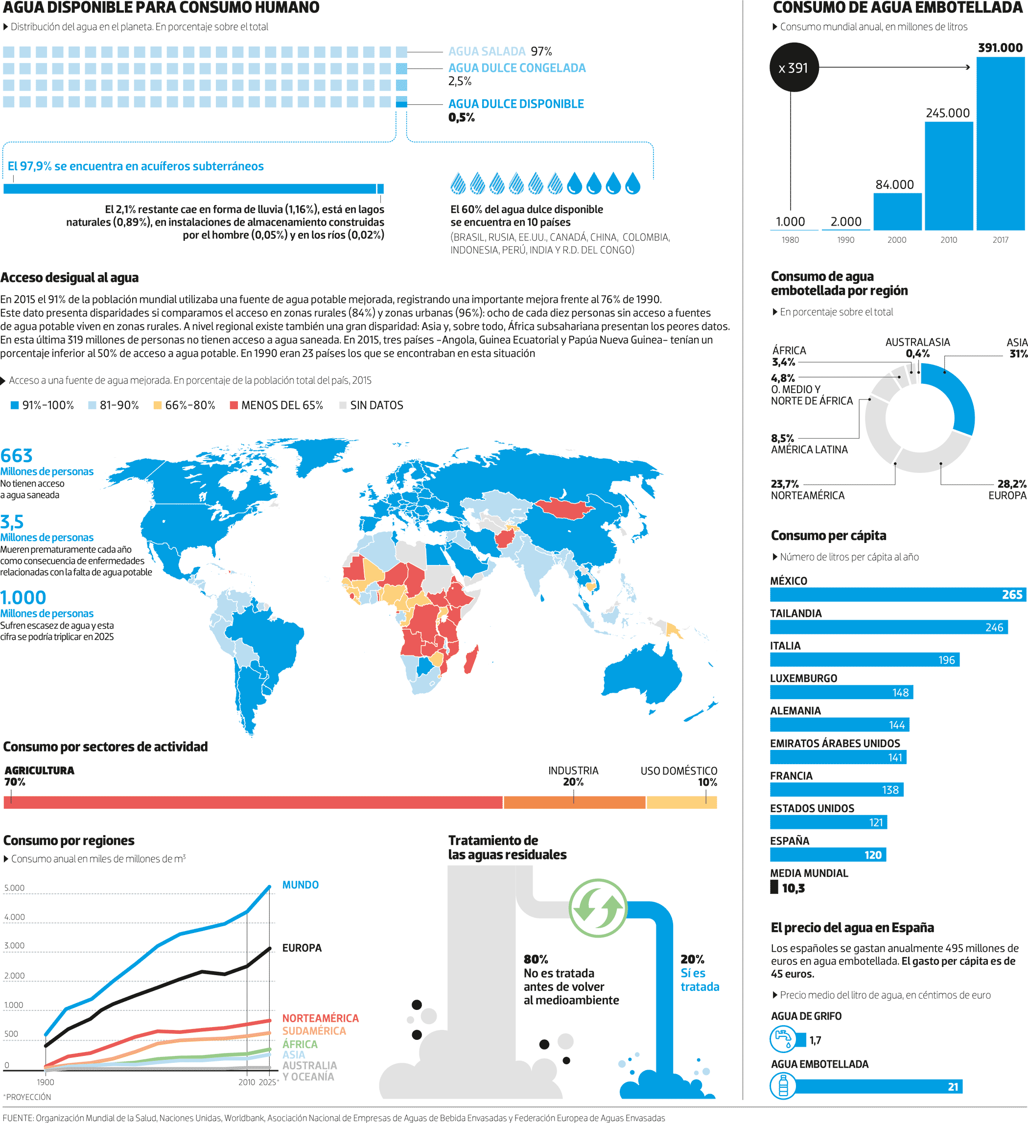 El agua es un recurso fundamental para el desarrollo de la actividad humana, pero apenas un 0,5% de la disponible es apta para el consumo humano. Por ello es fundamental asegurar la conservación de su calidad y el acceso a fuentes de agua potable. En 2015, nueve de cada diez personas pudieron disponer de agua saneada y por primera vez la cifra de quienes no lo lograron bajó de los 700 millones